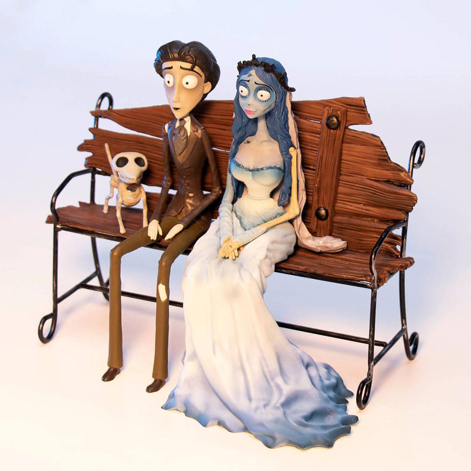 Μιά εμβληματική σκηνή από την ταινία του Tim Burton "The Corpse Bride" όπου ο Victor Van Dort και η Emily κάθονται μαζί με τον πιστό του Σκράπς σε ένα παγκάκι φτιαγμένο από ξύλινο φέρετρο.