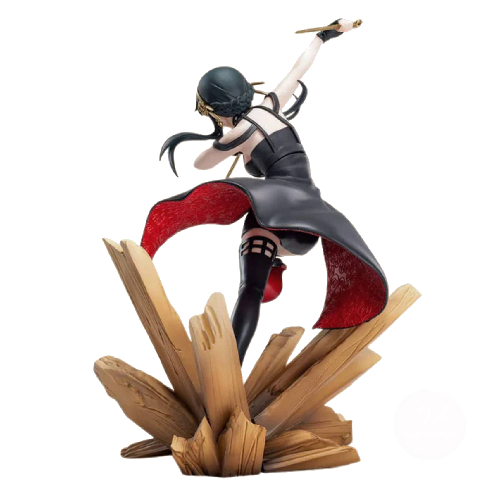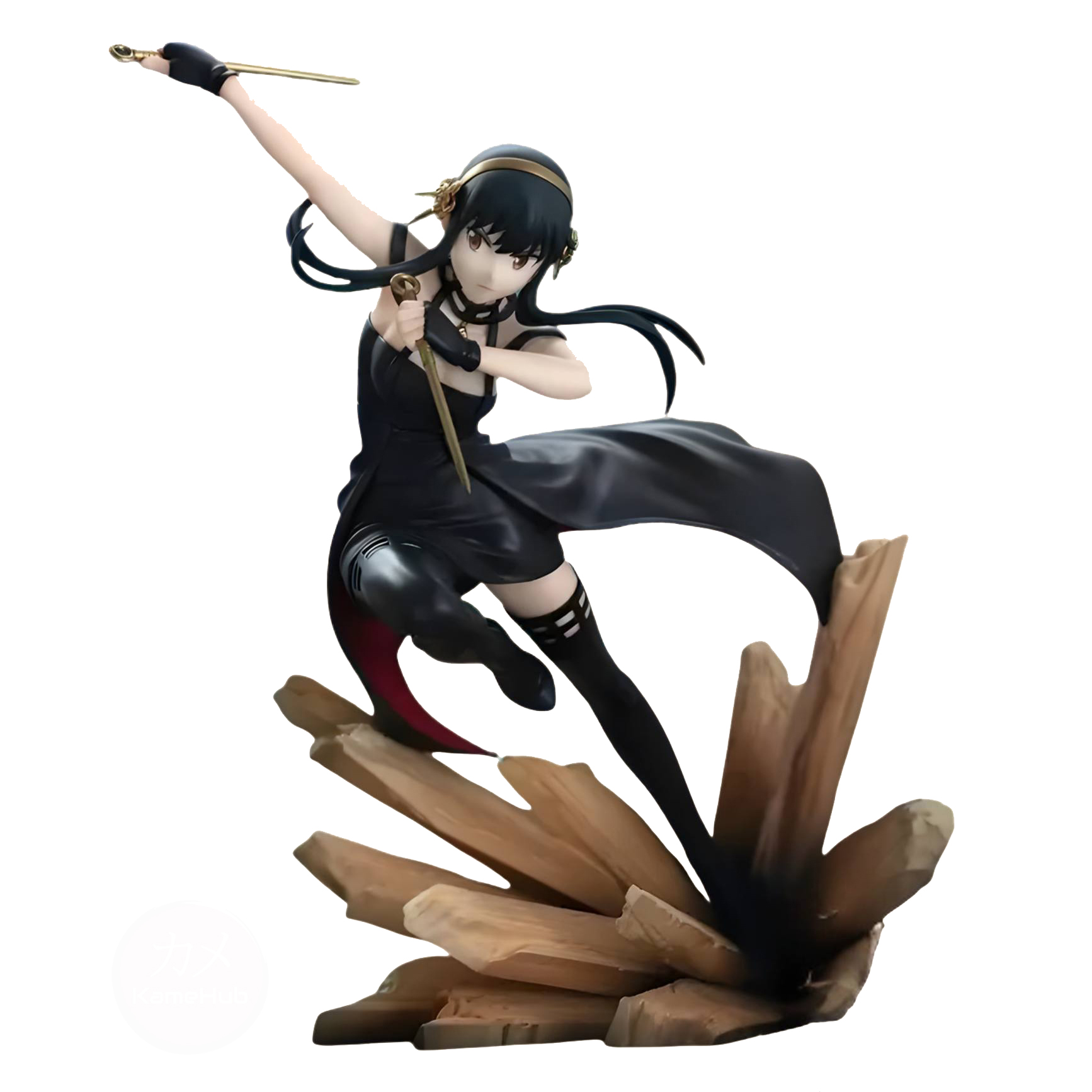 Η Yor απεικονίζεται σε δυναμική πόζα μάχης, κρατώντας τα χαρακτηριστικά της στιλέτα, αποδίδοντας τέλεια τη διπλή της φύση ως κομψή σύζυγος και θανάσιμη εκτελέστρια.